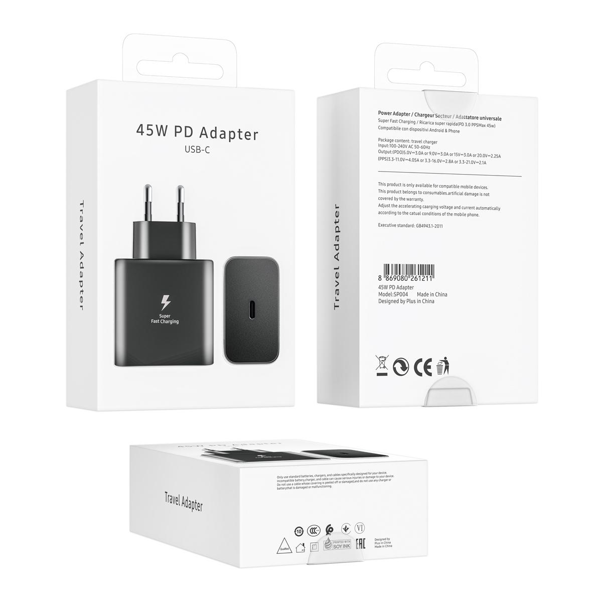 ADAPTADOR DE VIAJE CARGA SUPER RAPIDA 2.0 45W CON CABLE TYPE-C NEGRO COMPATIBLE