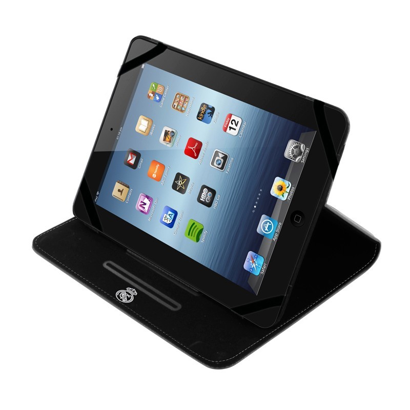 Funda universal diseñada en elegante color negro con el escudo del Real Madrid Club de Futbol en plateado. Fabricada con poliuretano de primera calidad, mantendrá tu Tablet perfectamente protegida de golpes, caídas, o suciedad que pueda dañar su estructura.