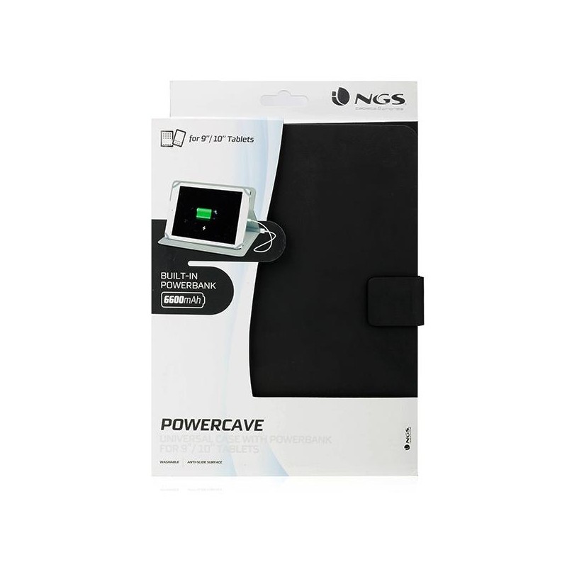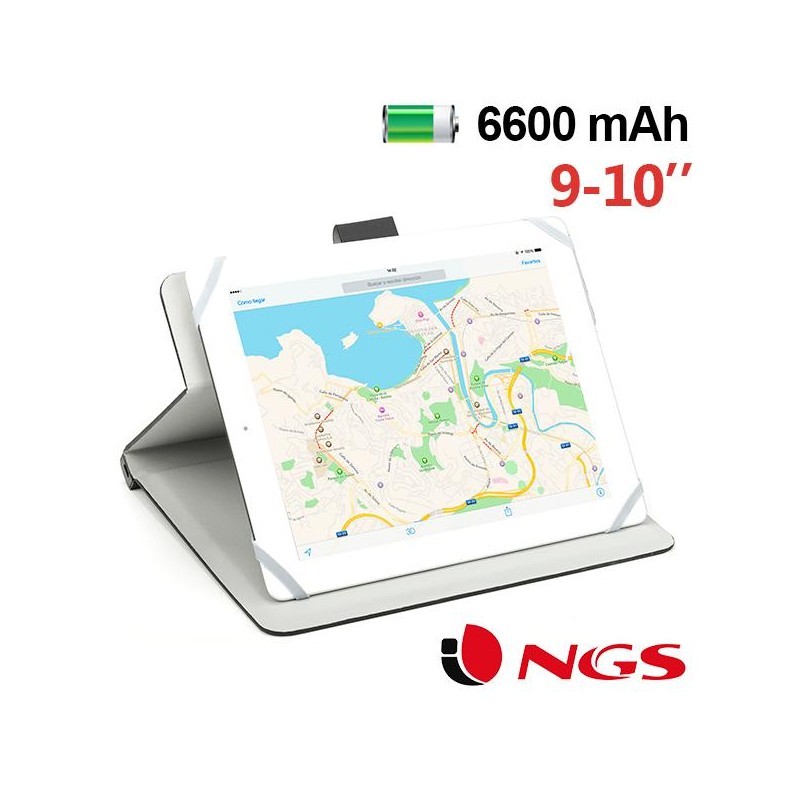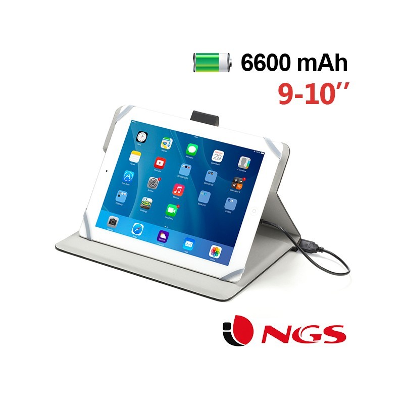 Funda con cargador de 6600 mAh universal para tabletas de 9 pulg - 10 pulg. fabricada en materiales altamente resistentes con suave revestimiento interior. Puede utilizarse como soporte. El cargador de 6600 mAh permite cargar tanto tabletas como smartphones. |